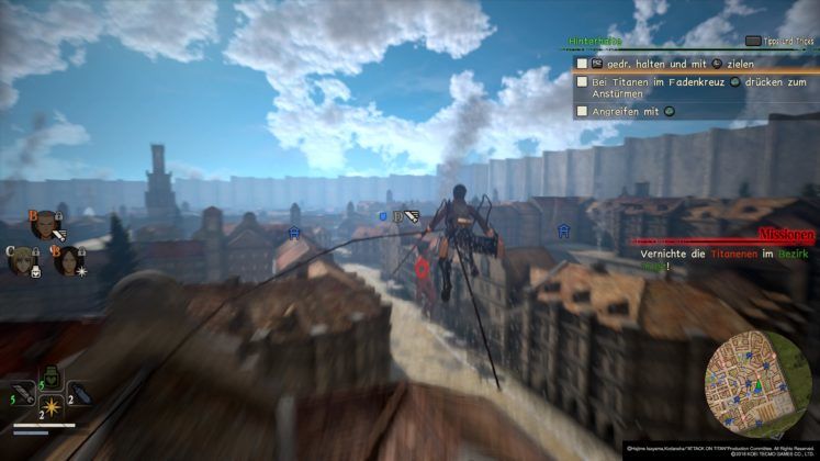 Die Kämpfe runden diverse Manöver sowie Unterstützung durch Teamkameraden ab. So könnt ihr nicht einfach nur die Schwachstellen der Titanen angreifen, sondern auch stylische Techniken verwenden. Weicht ihr beispielsweise einem Titanen aus und drückt im richtigen Moment die Angriffstaste, wird eine kurze Videosequenz ausgeführt, in der ihr dem Titan ordentlich Dampf macht. Durch Hinterhalt Angriffe kann ebenfalls mächtig Schaden ausgeteilt werden. Dazu nehmt ihr einen der Riesen durch ein Fadenkreuz ins Visier und drückt dann die Angriffstaste. Mit einer extremen Geschwindigkeit schießt ihr euch auf den Gegner und verpasst ihm einen mächtigen Schlag, vorausgesetzt ihr tippt im richtigen Moment die Angriffstaste und verfügt über ausreichend Gas. Es sollte außerdem stets darauf geachtet werden, dass ihr bei einem Hinterhalt nicht von den Biestern gesehen werdet. Anderenfalls werden diese leicht sauer und stürzen sich unmittelbar auf euch.