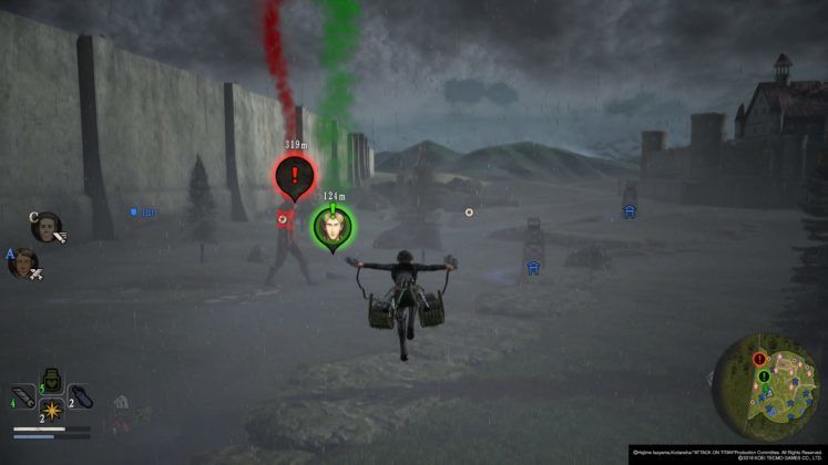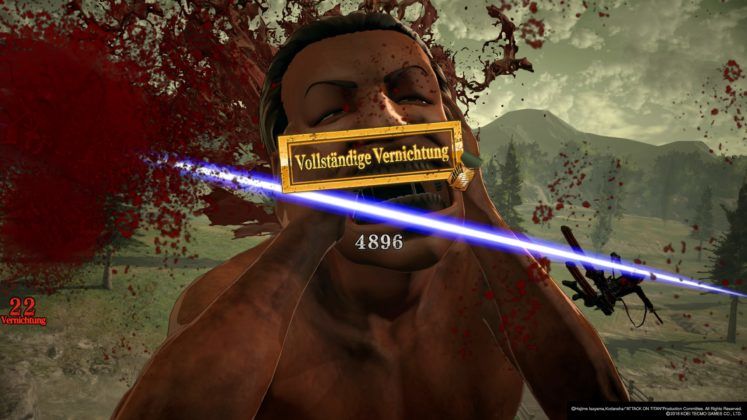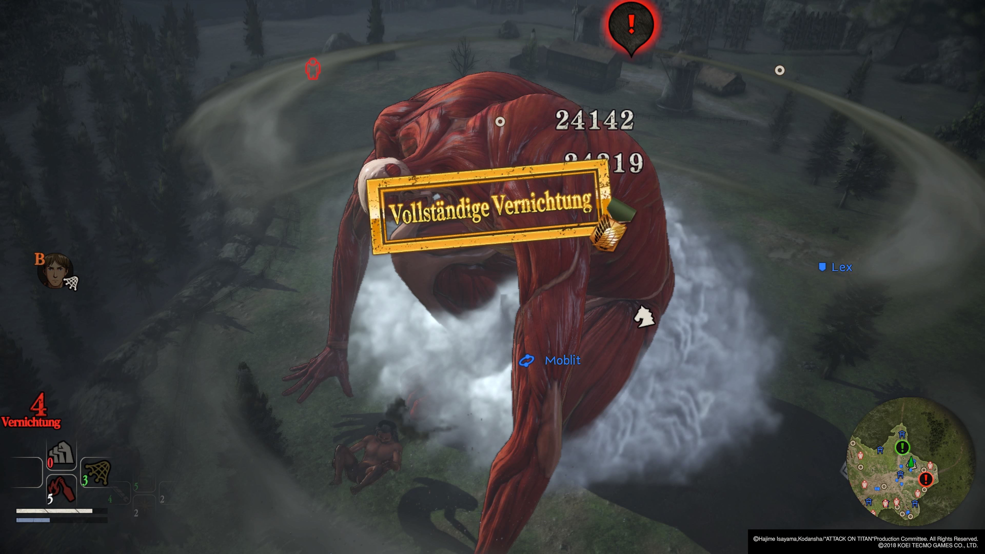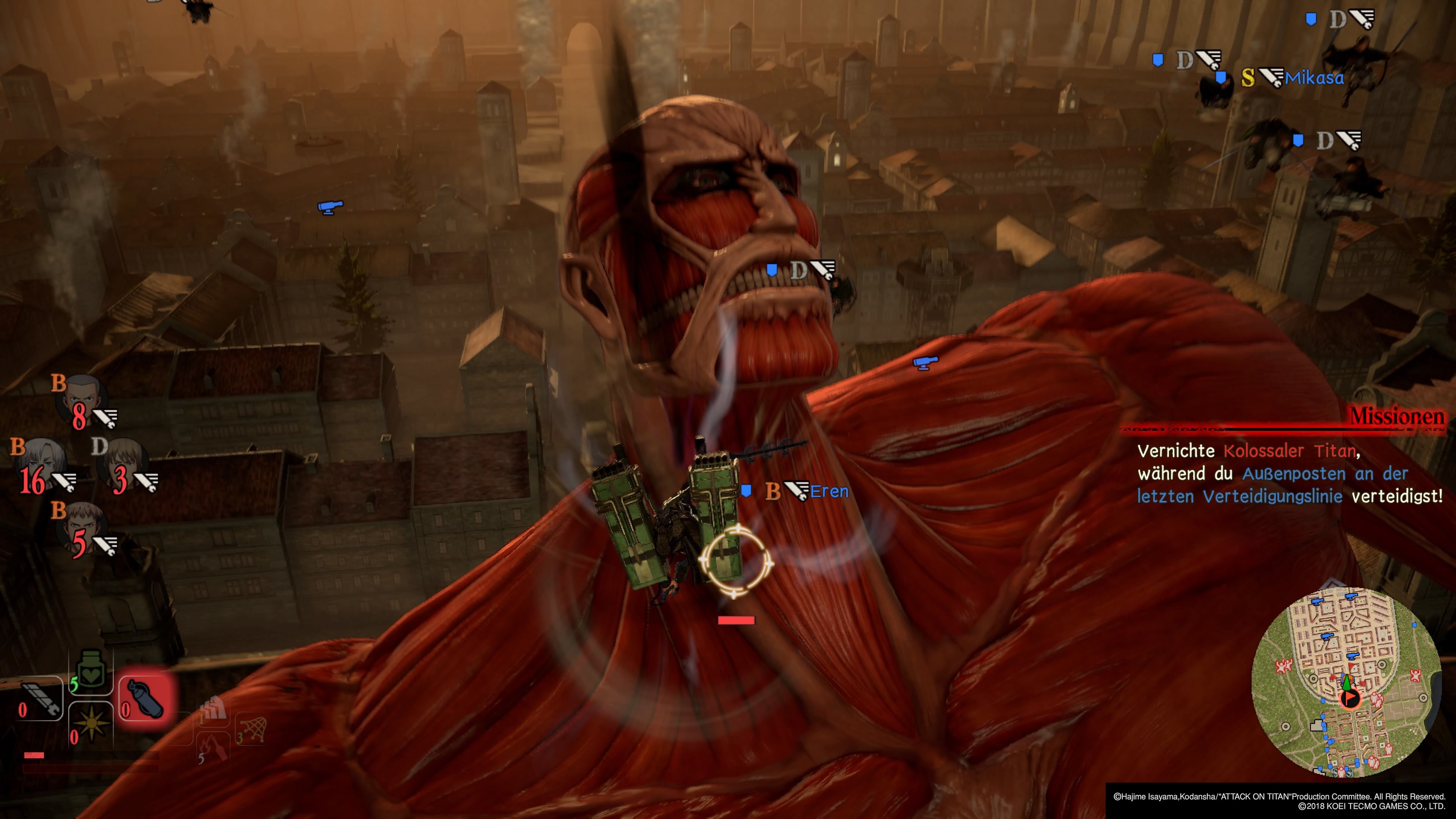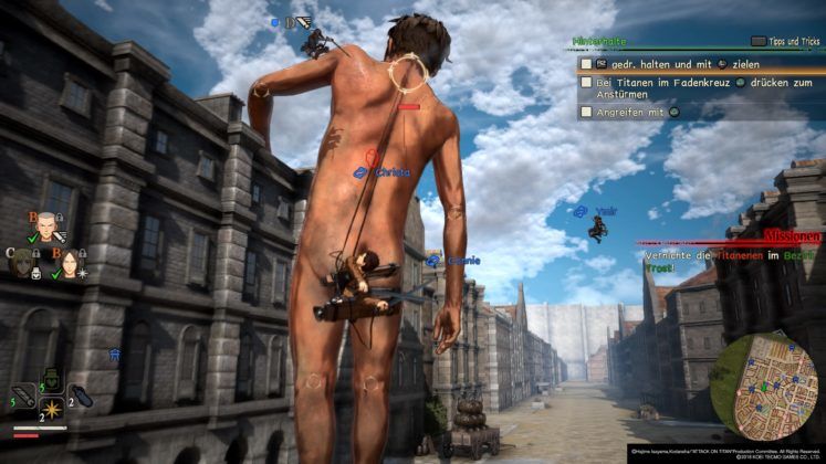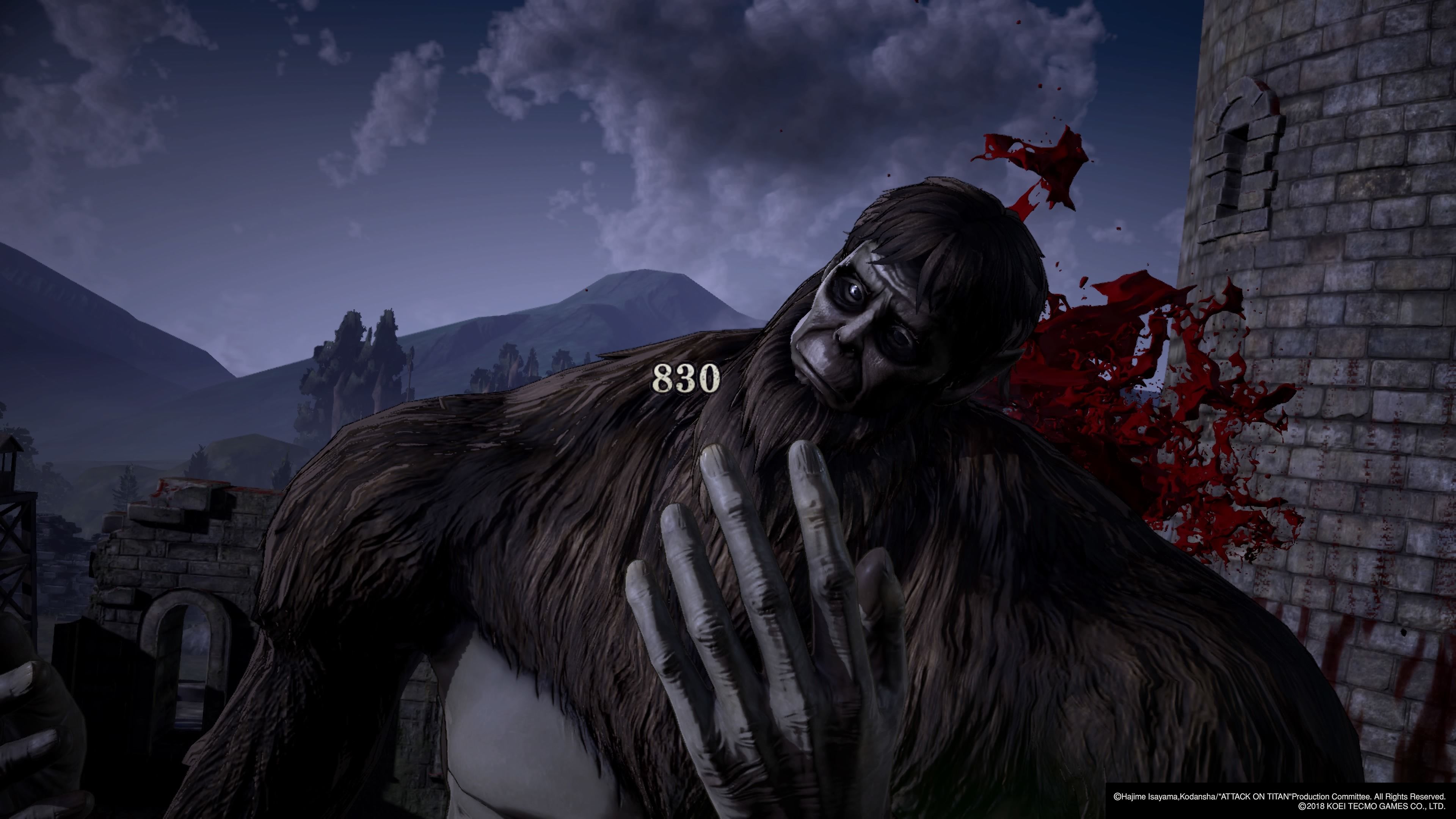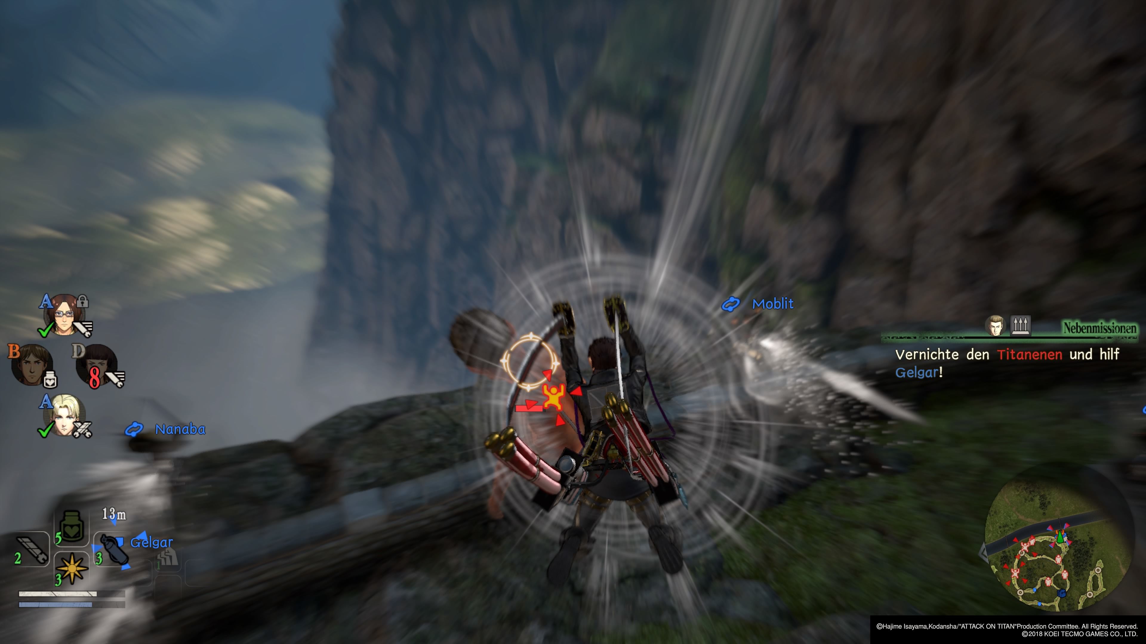Wie im Anime gibt es auch unterschiedliche Rassen der Widersacher. Normale Titanen greifen grundsätzlich alle Menschen in der Nähe an, während Abnorme Titanen nur ein bestimmtes Ziel verfolgen, welches keiner genau vorhersehen kann. Auch in der Größe unterscheiden sich die Biester stark. So sind 3m, 7m und 15m Riesen auf dem Schlachtfeld unterwegs. Je größer die Gegner, umso mehr Verteidigungswerte haben diese. Bedrohlicher werden die Feinde dadurch allerdings nicht. Einige Titanen fangen sogar an auf allen Vieren zu krabbeln. Bis auf ein unterschiedliches Fortbewegungsmuster ändert sich an deren Bedrohlichkeit jedenfalls ebenfalls nichts. Zu guter Letzt gibt es noch die „Minibosse“ im Spiel. Das sind Titane, die über eine starke Abwehr verfügen. Es bringt nichts direkt ihren Nacken zu attackieren. Vorher müssen erst grün aufleuchtende Gliedmaßen angegriffen werden. Daraufhin leert sich die Schutzleiste. Sobald diese leer ist, kann man sich auf den Nacken stürzen. Auch hier gilt wieder außer einer erhöhten Defensive ist mir kein merklicher Unterschied zu seinen normalen Artgenossen aufgefallen.