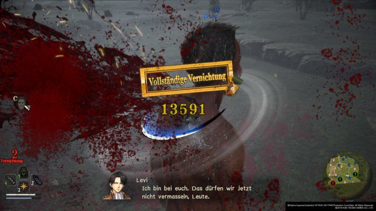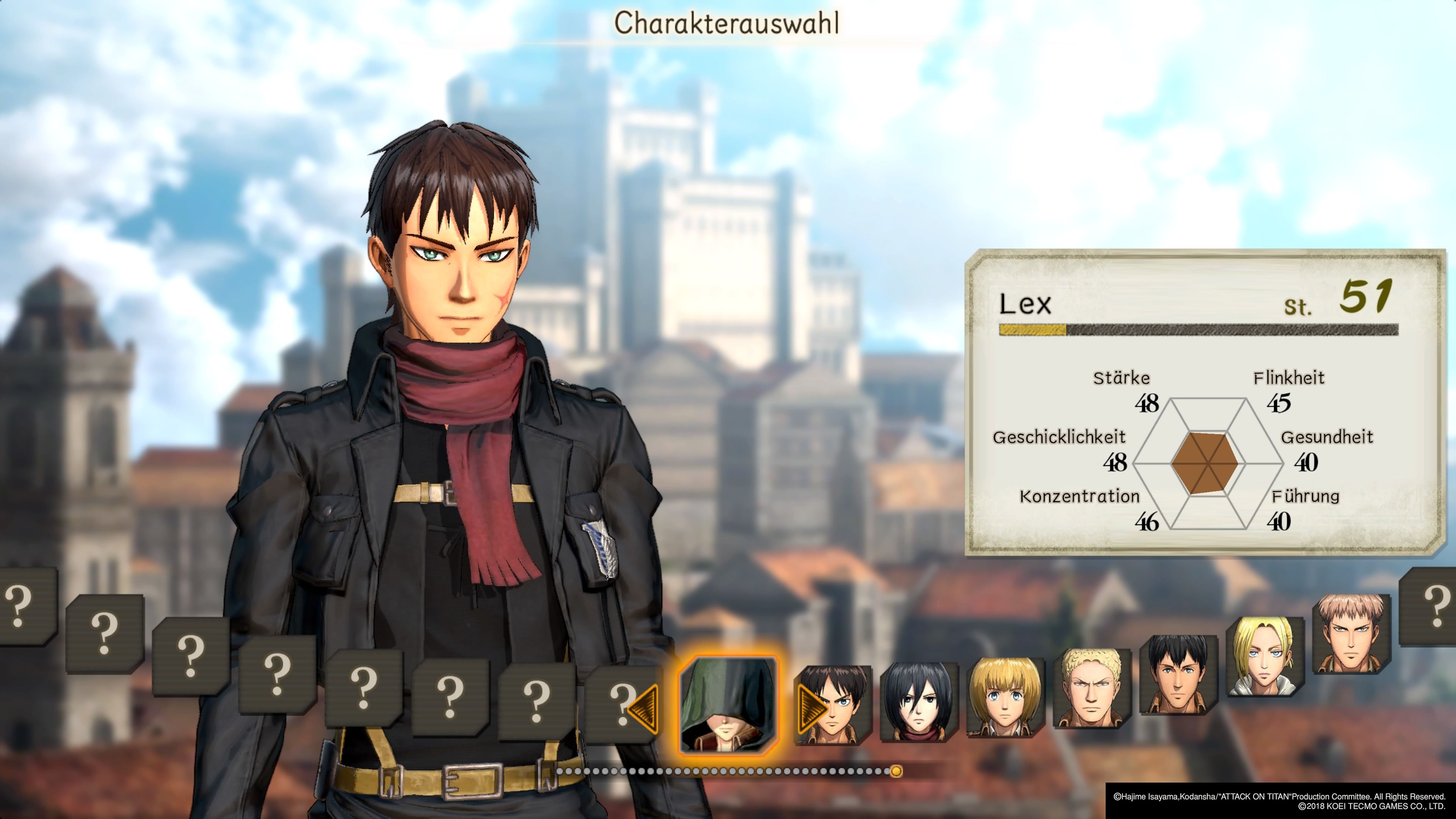 Jeder Charakter spielt sich dabei ein wenig unterschiedlich. Truppenführer Levi greift mit rotierenden Angriffen an, während Eren sich in einen Titanen verwandeln kann. Statuswerte wie Geschicklichkeit, Flexibilität oder Gesundheit spielen dabei auch eine Rolle. Alle Charaktere verfügen zu Beginn über unterschiedliche Stats.