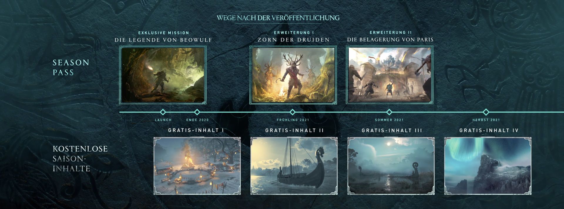 - Erweiterung I trägt den Titel Zorn der Druiden. Sie erscheint im Frühjahr 2021 und findet in Irland statt. Der DLC dreht sich um den Druidenkult, beinhaltet somit verstärkt übernatürliche und mystische Elemente.