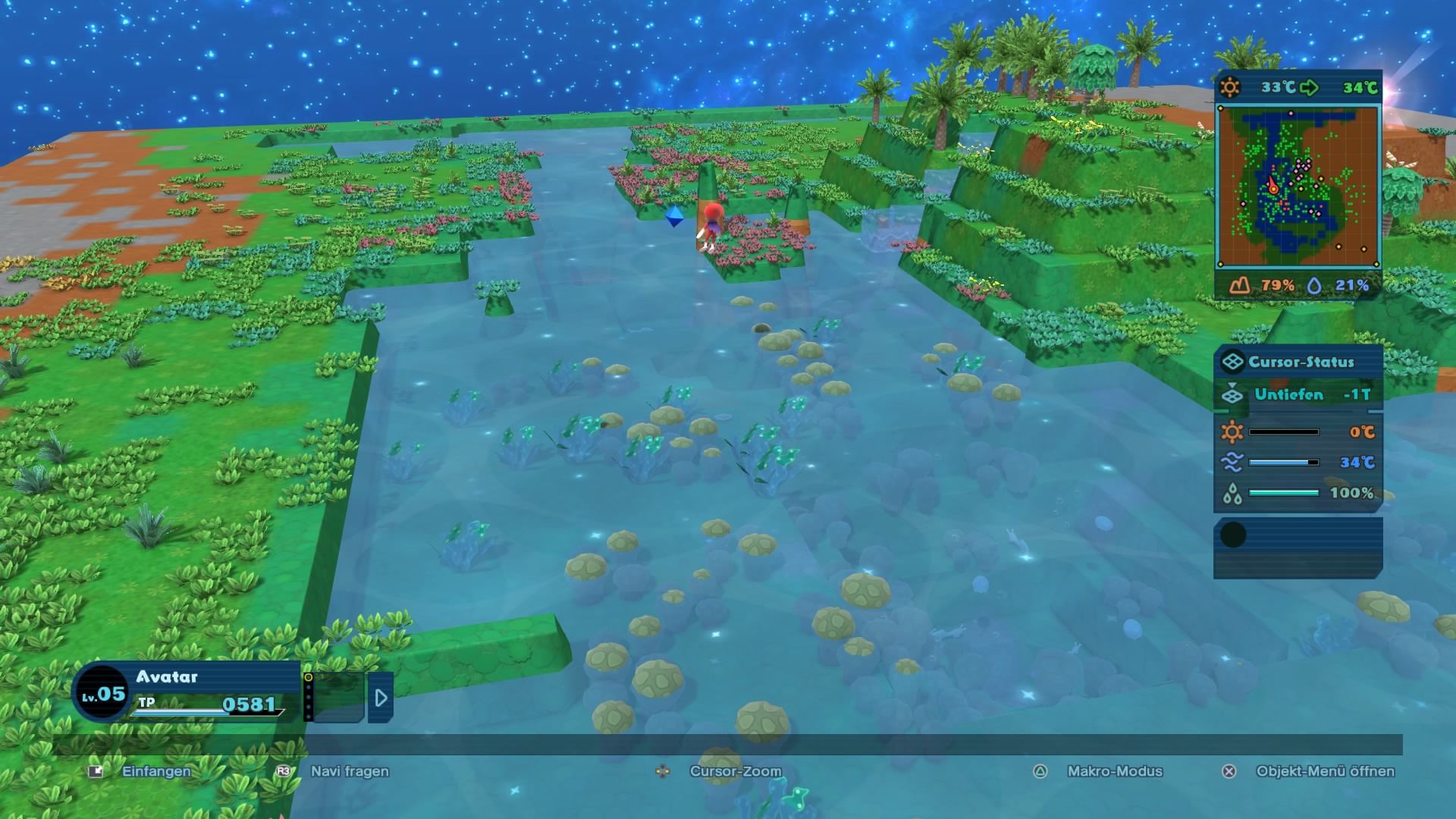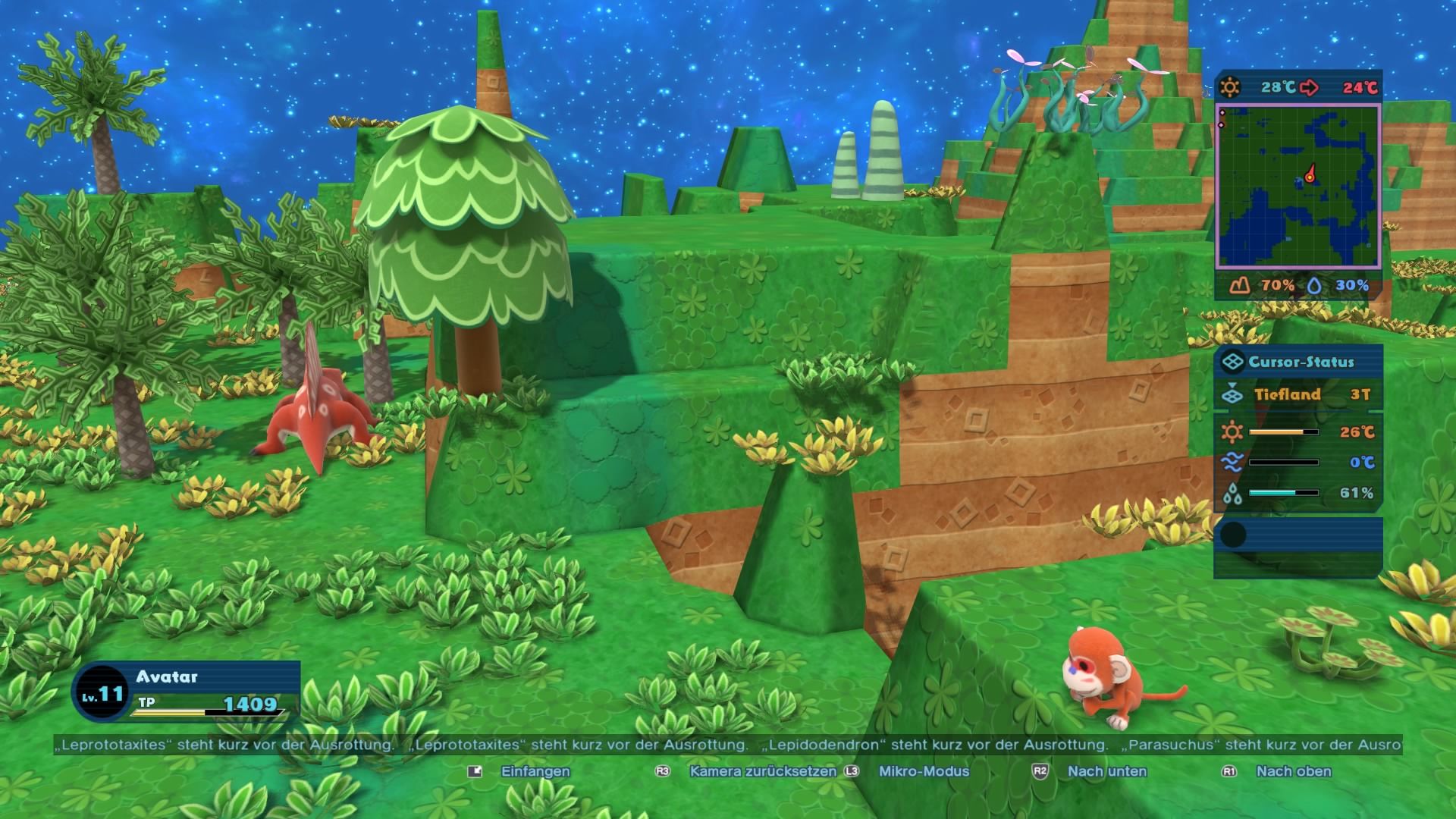 Um euch ein wenig auf die Sprünge zu helfen gibt es zudem diverse Items, die euch bei eurem Vorhaben unterstützen. Durch den Einsatz dieser Hilfsmittel könnt ihr beispielsweise eine künstliche Eiszeit zur sofortigen Temperatursenkung herbeizaubern oder die Evolution gewisser Arten künstlich beschleunigen. Auch Funktionen zur erleichterten Veränderung der Umwelt stehen euch manchmal zur Verfügung: ein Item lässt einen großen Berg oder ein tiefes Tal aus dem Nichts entstehen, andere Werkzeuge regulieren die Feuchtigkeit oder erzeugen Flussquellen. Fangt ihr zudem neue Lebewesen ein, erhaltet ihr nicht nur genaue Informationen über ihre Lebensbedingungen, sondern lasst auch euren Avatar im Level ansteigen. Dies hat zur Folge, dass ihr wesentlich größere Radien an Landmasse zur gleichen Zeit beeinflussen könnt.