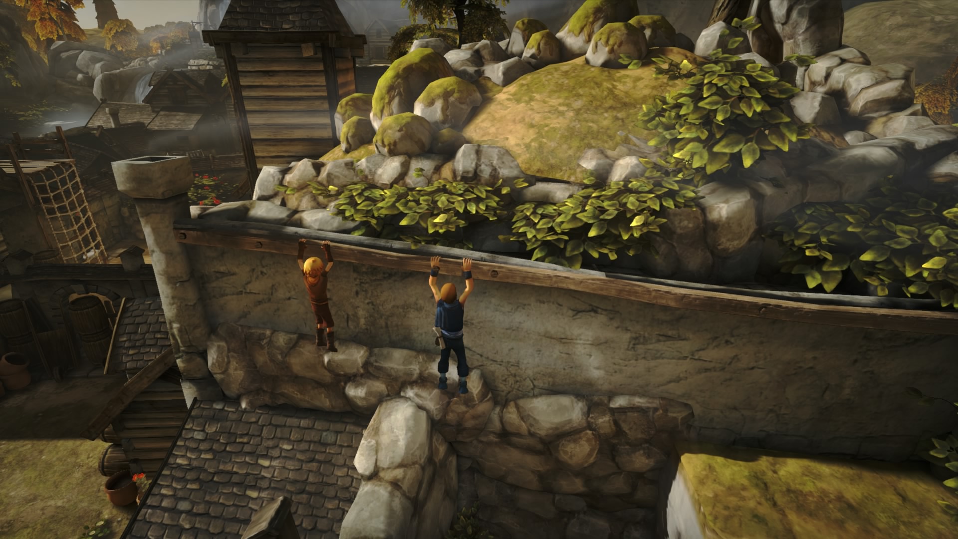Der Titel startet auf eine ernste, bedrückende Note und setzt schnell den Ton für das gesamte Spiel fest. Da Brothers von seiner Story lebt, werde ich auf keinerlei Details eingehen, um Erstspielern die Chance zu geben, die Handlung selbst zu erleben. So viel sei aber gesagt: Die Geschichte spielt mit vielen Emotionen, wechselt von Freude zu Traurigkeit und nimmt euch auf ein teils schönes, teils erschöpfendes Abenteuer mit. Zwei Brüder brechen mit einem bestimmten Ziel zu einer Reise auf. Auch wenn die Prämisse des Spiels traurig scheint, versprühen die Brüder auf dem Weg auch durchaus schöne Momente, die von gemeinsamen Errungenschaften geprägt sind. Ebenso bietet das Abenteuer aber auch äußerst düstere Momente. Das Wechselbad der Emotionen ist effektiv und macht Brothers zum denkwürdigen Spiel. Weiterhin eine Besonderheit: Der Titel bietet keine üblichen Konversationen, sondern lässt die Brüder in einer Fantasiesprache miteinander kommunizieren. Obwohl wir als Spieler kein Wort verstehen, macht uns der Titel eine Interpretation dennoch leicht. Die Emotionen und die Story werden durch das Geschehen und durch die gezeigte Körpersprache und Mimik gekonnt herübergebracht, was einmal mehr eine Besonderheit von Brothers darstellt. Ein überaus starkes, ergreifendes Ende rundet Brothers: A Tale of Two Sons als außergewöhnlich gutes Erlebnis ab.