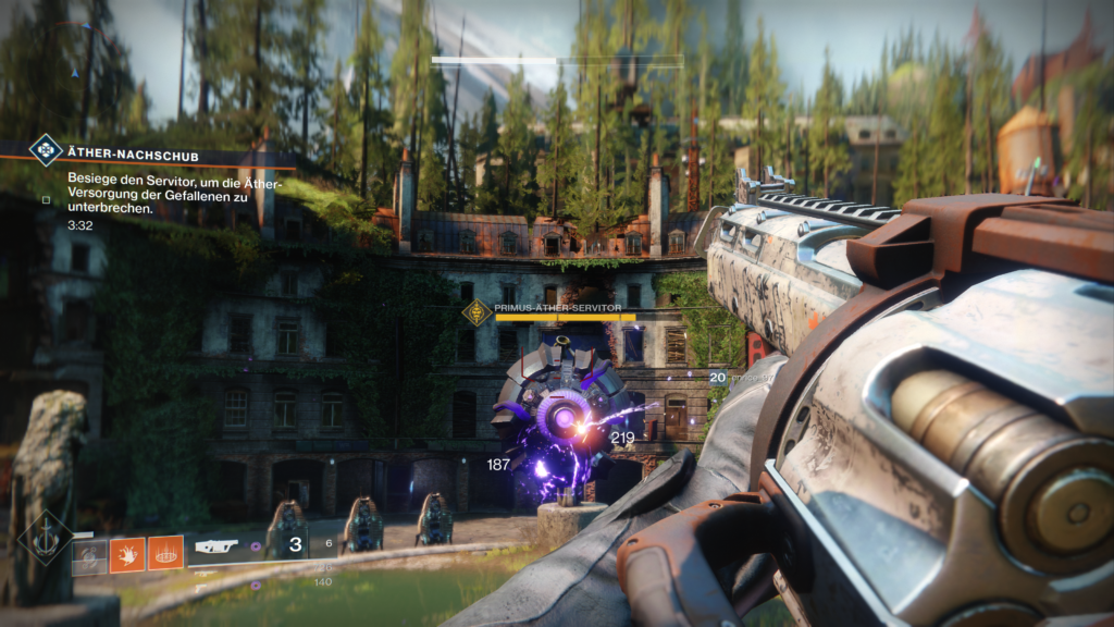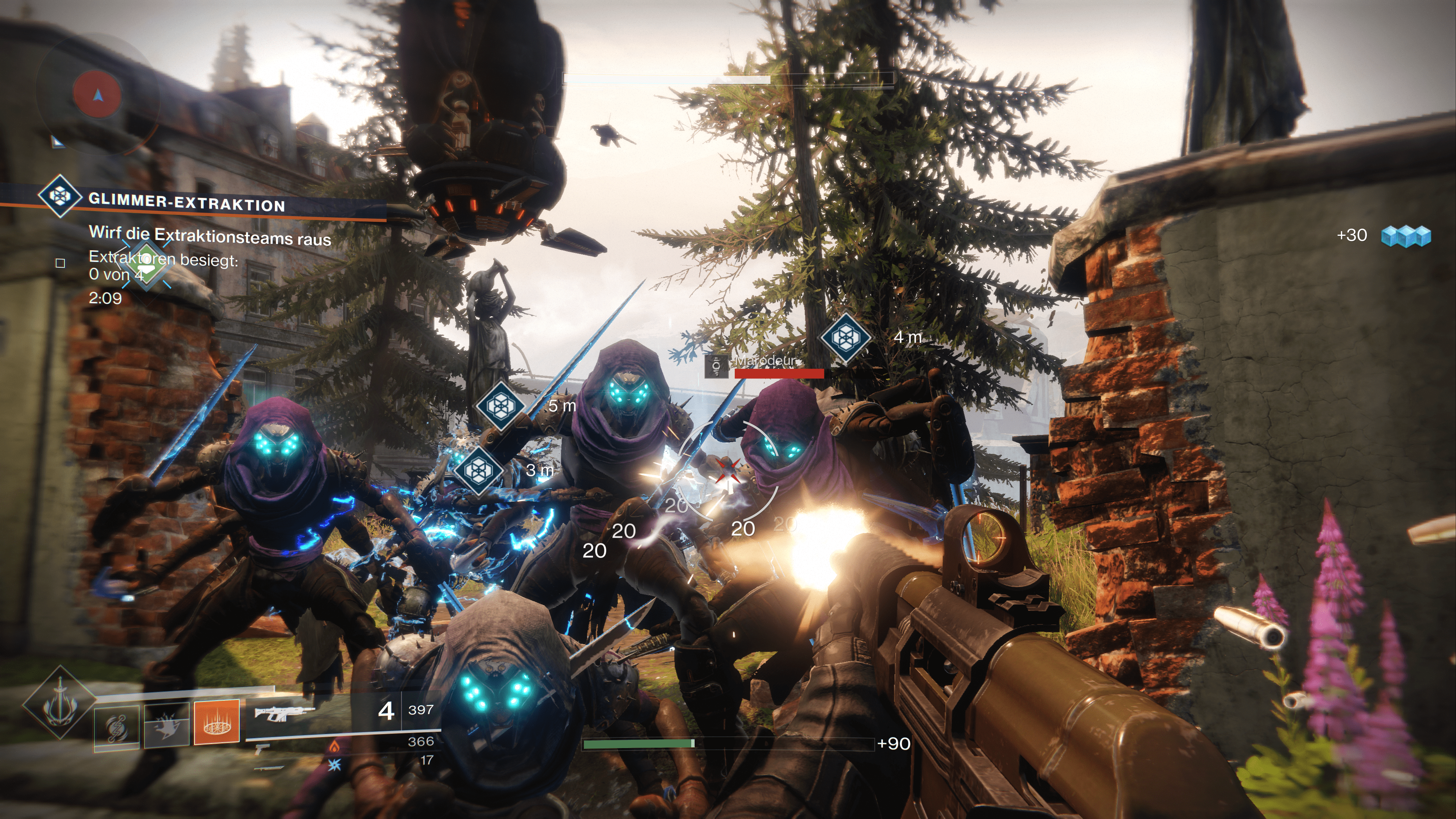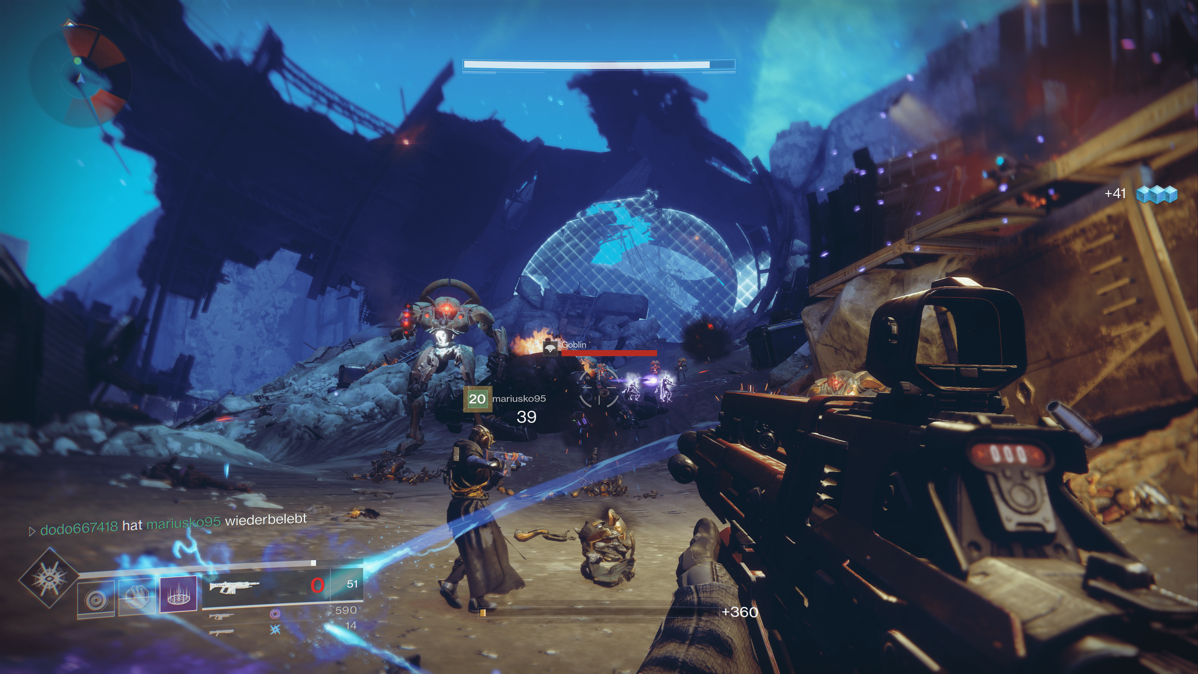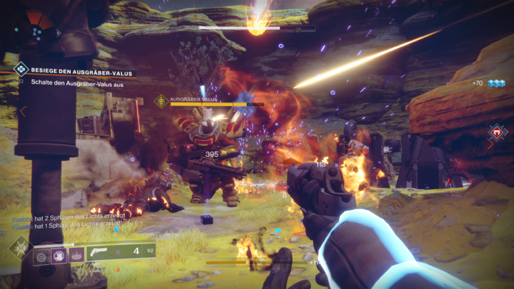 Sämtliche Missionen lassen sich gemeinsam mit anderen Spielern angehen. Mit Ausnahme von wenigen Story-Missionen etabliert Destiny 2 vollends sein “Player vs Environment”-Konzept. Spieler können mit bis zu drei Freunden in die Schlachten ziehen. In den offenen Welten sind zudem auch fremde Spieler unterwegs, die ihr eigenes Ding machen. Alle paar Minuten finden in der Spielwelt öffentliche Events statt, die Spieler vereint gegen knifflige Feinde kämpfen lassen. Diese Aufgaben werden leider recht schnell repetitiv, da sie sich auch planetenübergreifend wiederholen. Dennoch nehme ich auch nach vier Wochen noch gerne an den öffentlichen Events teil, was nicht nur daran liegt, dass die Lootausbeute hier vergleichsweise gut ausfällt. Mir macht es immer wieder Spaß zu sehen, wie mehrere Fremde ihre aktuellen Tätigkeiten stehen und liegen lassen und gemeinsam mit mir in den Kampf gegen übergroße Feinde ziehen. Zwar ist bei der Bewältigung der gestellten Aufgabe kaum Koordination oder Absprache nötig, da es zumeist auf stumpfes Ballern hinausläuft. Trotzdem überzeugt das Gemeinschaftsgefühl, wenn mich ein fremder Mitspieler ohne Aufforderung wiederbelebt und man gemeinsam in Richtung der großen Lootkiste voller Aufregung über den Inhalt läuft.