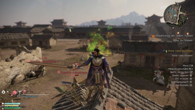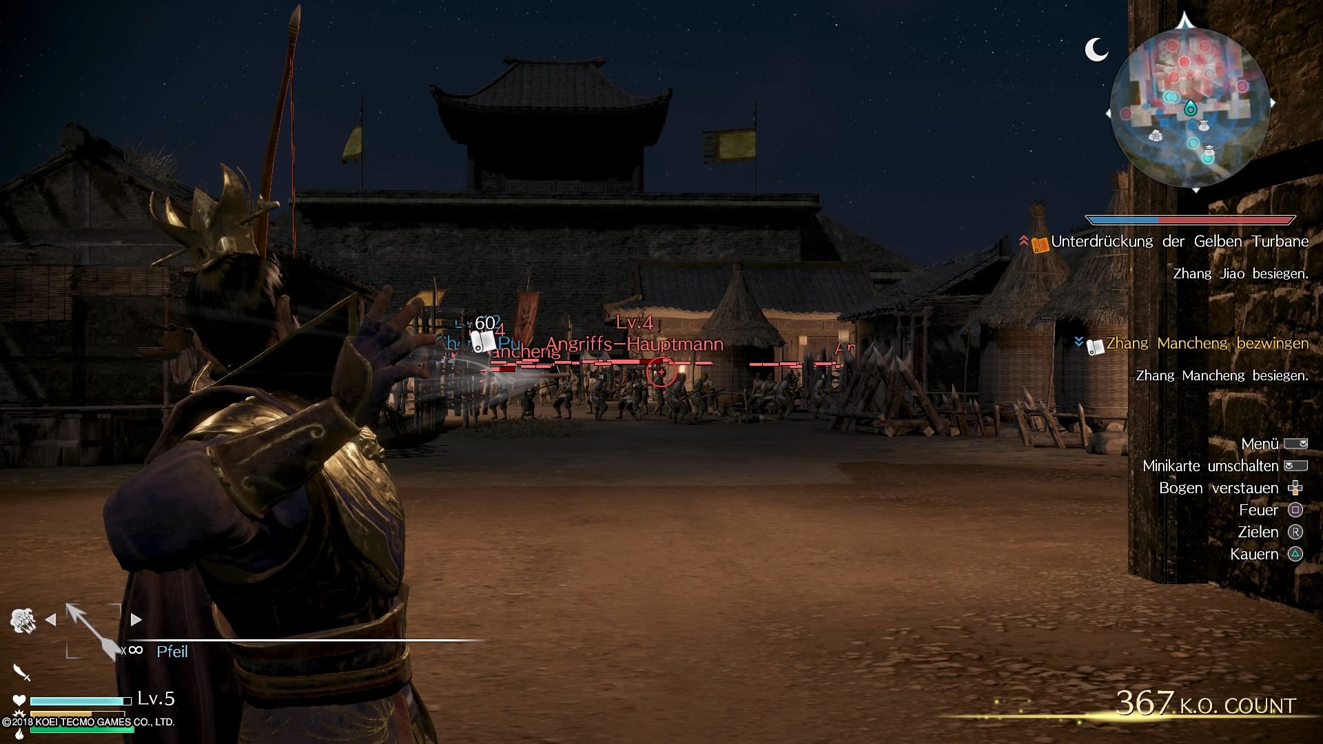 In den Dörfern könnt ihr neue Waffen kaufen und sie durch die Fertigung von Juwelen mit zusätzlichen Effekten ausrüsten. Auch mit diversen Items für Boosts der Statuswerte oder zum Heilen der Gesundheit könnt ihr euch ausstatten. Richtig vorbereitet können die Kämpfe dann auch wirklich unterhaltsam sein, euch ein gutes Fünkchen Taktik abverlangen und euch durch den Soundtrack mit rasanter Gitarrenmusik in einen Action-Rausch verfrachten. Ihr wechselt zwischen hektischen Nahkampf-Scharmützeln und gezielten Angriffen auf Anführer von Kriegertruppen. Ist dieser ausgeschaltet – was oft ein zentrales Missionsziel ist – geben sich auch seine Anhänger geschlagen. Spezialangriffe stehen zwar auch auf dem Programm, oft metzelt ihr euch aber ohne viel nachzudenken durch die Kriegeransammlungen. Zum Erreichen neuer Schlachten müsst ihr übrigens nicht alle Wege zu Fuß zurücklegen, sondern könnt euch auch auf euer Pferd schwingen oder die Schnellreisefunktion nutzen. Für ein bisschen mehr Abwechslung sorgen auch der Bogen für Fernangriffe sowie der Grappling Hook, mit dem ihr euch auf Gebäude katapultieren könnt. Anspruchsvoll wird Dynasty Warriors 9 erst zu vorangeschrittener Spielzeit, bis dahin freue ich mich als Serien-Neuankömmling über das einsteigerfreundliche Kampfsystem.