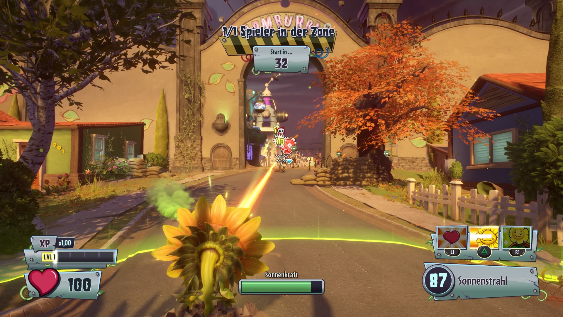 Während sich am tollen Spielgeschehen nichts geändert hat und sowohl Solospieler-Inhalt als auch Figurenaufgebot erweitert wurden, gibt es im Multiplayer-Umfang eine nicht ganz so schöne Nachricht zu vermelden: Der Modus Taco Banditen, der sich als spaßige Capture The Flag-Variante präsentierte, ist nicht mehr enthalten. Stattdessen sind andere Spielmodi enthalten, sodass sich der Umfang dennoch sehen lassen kann. Team-Sieg und Sieg bestätigt sind klassische Team-Deathmatch-Modi. Auch das Konzept von Surburbination dürfte bekannt sein, so ähnelt es mit seinen drei Kontrollpunkten doch stark einer Domination-Spielvariante. Gartenzwerg-Bombe kehrt zum Glück zurück, denn auch hier hatte ich großen Spaß im ersten Teil. Eine Gnom-Bombe wartet in den Arealen, die zur Zerstörung von drei Punkten auf der Map genutzt werden muss. Rasenübernahme präsentiert sich als Neuheit. Hier teilen sich die Teams auf Angreifer und Verteidiger auf. Die Angreifer müssen einen Punkt auf der Karte erobern, was die Verteidiger zu verhindern versuchen. Ist ein Punkt erobert, eröffnet sich ein neues Stück der Umgebung mit einem neuen Kontrollpunkt. Werden alle Punkte erobert, gewinnen die Angreifer. Schaffen sie dies nicht in der vorgegebenen Zeit, gehen die Verteidiger als Sieger vom Platz. Da die Leiste der Kontrollübernahme sich nur füllen, nicht aber durch erfolgreiche Verteidigung wieder leeren kann, spielen sich die Partien allerdings keineswegs unfair – obwohl sich die Angreifer durchaus für einen Sieg anstrengen müssen. Ich hatte Spaß an allen Modi und habe mich dementsprechend über eine gemischte Playlist gefreut, in der alle Spielvarianten rotiert werden. Mit gutem Matchmaking und solidem Netzcode ist der Online-Multiplayer einmal mehr ein toller Zeitvertreib.