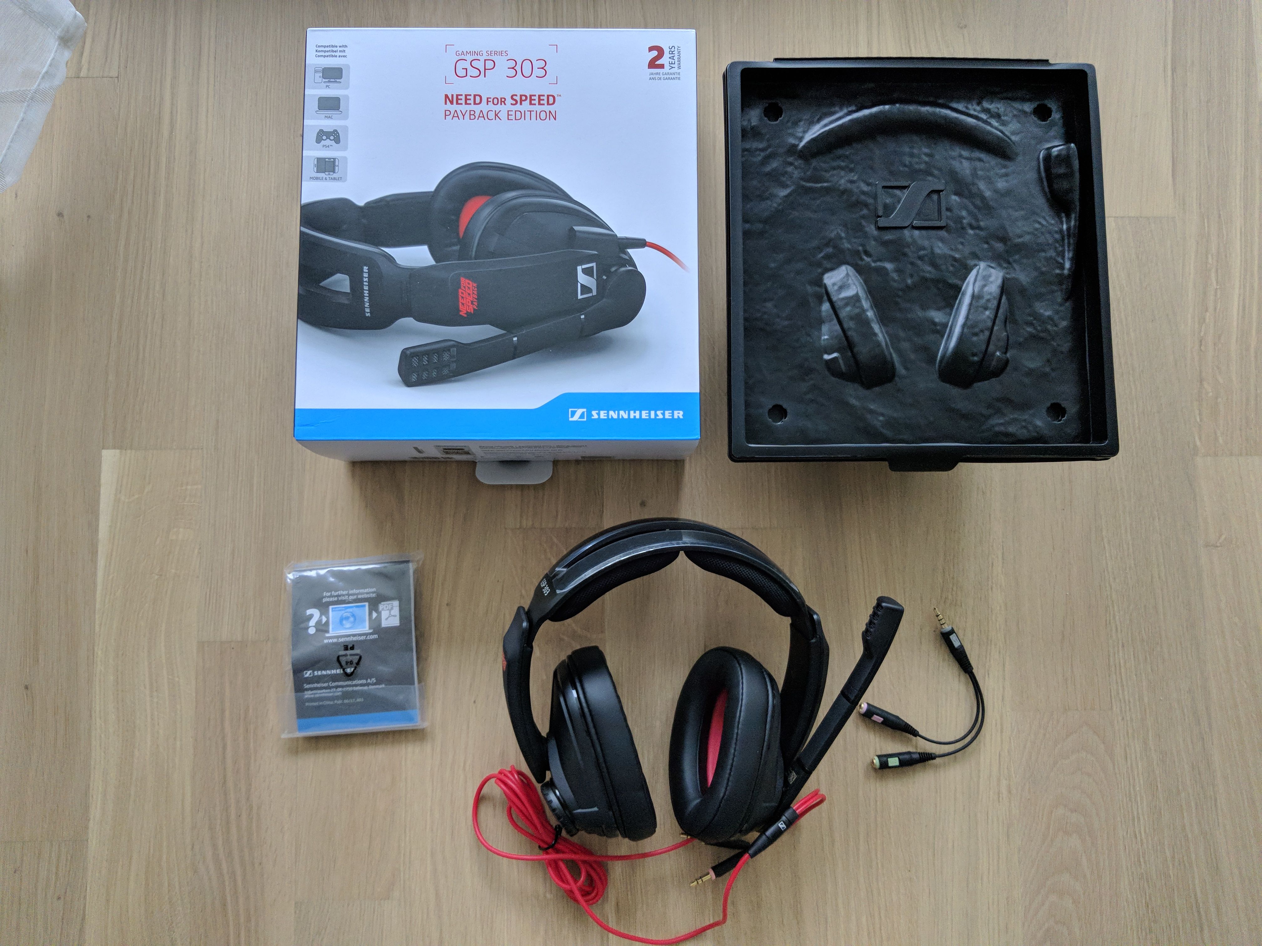 Das Headset besteht aus einem Hartplastikgestell, das insgesamt einen sehr robusten Eindruck macht. Neben dem Sennheiser-Logo und dem Modellnamen “GSP 303” wird das Headset vom Need For Speed Payback-Schriftzug geziert. Das Spiellogo ist auf beiden Seiten des Headsets sowie auf den beiden Ohrmuscheln aufgedruckt. Es ist nicht zu auffällig und sollte dementsprechend auch die nicht stören, die kein Fan des Rennspiels von EA sind. Die Farbkombination aus Rot und Schwarz resultiert in einer hübschen Optik. Auch das rote Kabel trägt dazu bei, dass das Gaming Headset ansprechend aussieht. Während es prinzipiell schick gestaltet ist, wirkt es etwas sperrig. Auf meinem Kopf sieht es erstaunlich groß aus und auch bei der Verstauung kann es stören, dass es so klobig ausfällt. Es kann nämlich nicht zusammengeklappt werden. Das ist aber nur ein kleines Manko und ändert nichts an der Tatsache, dass Sennheiser mit dem GSP 303 ein schickes Produkt entworfen hat.