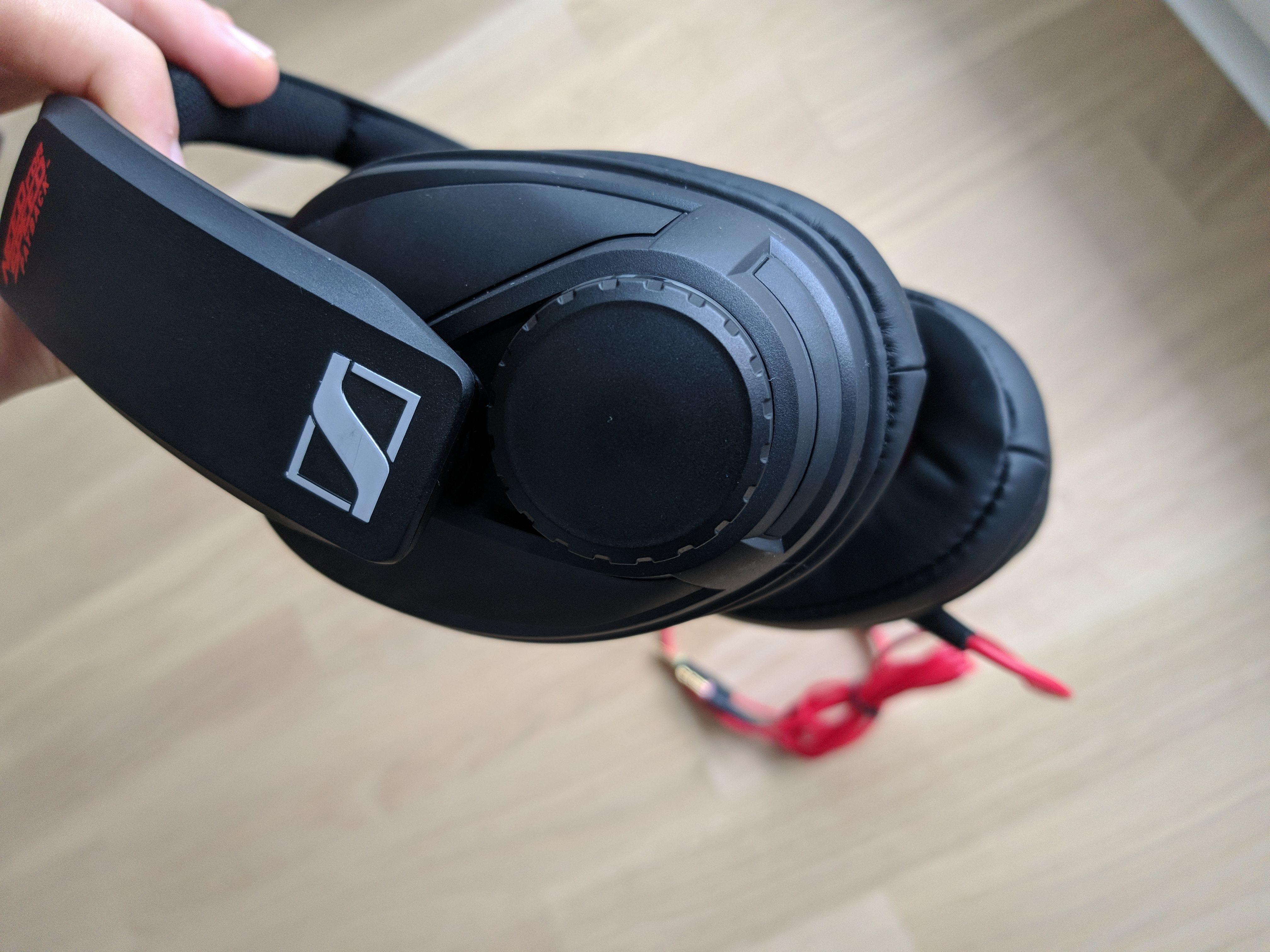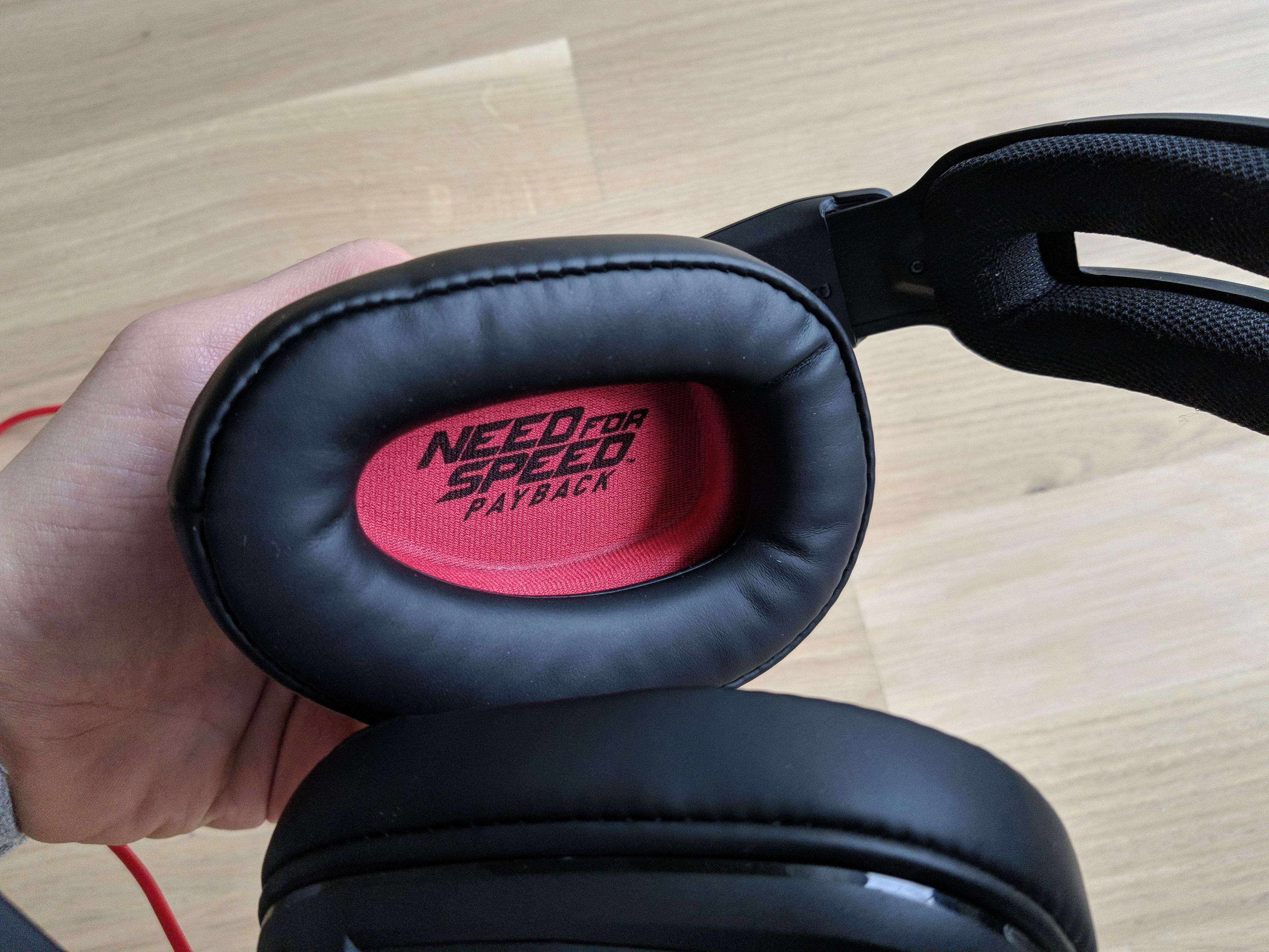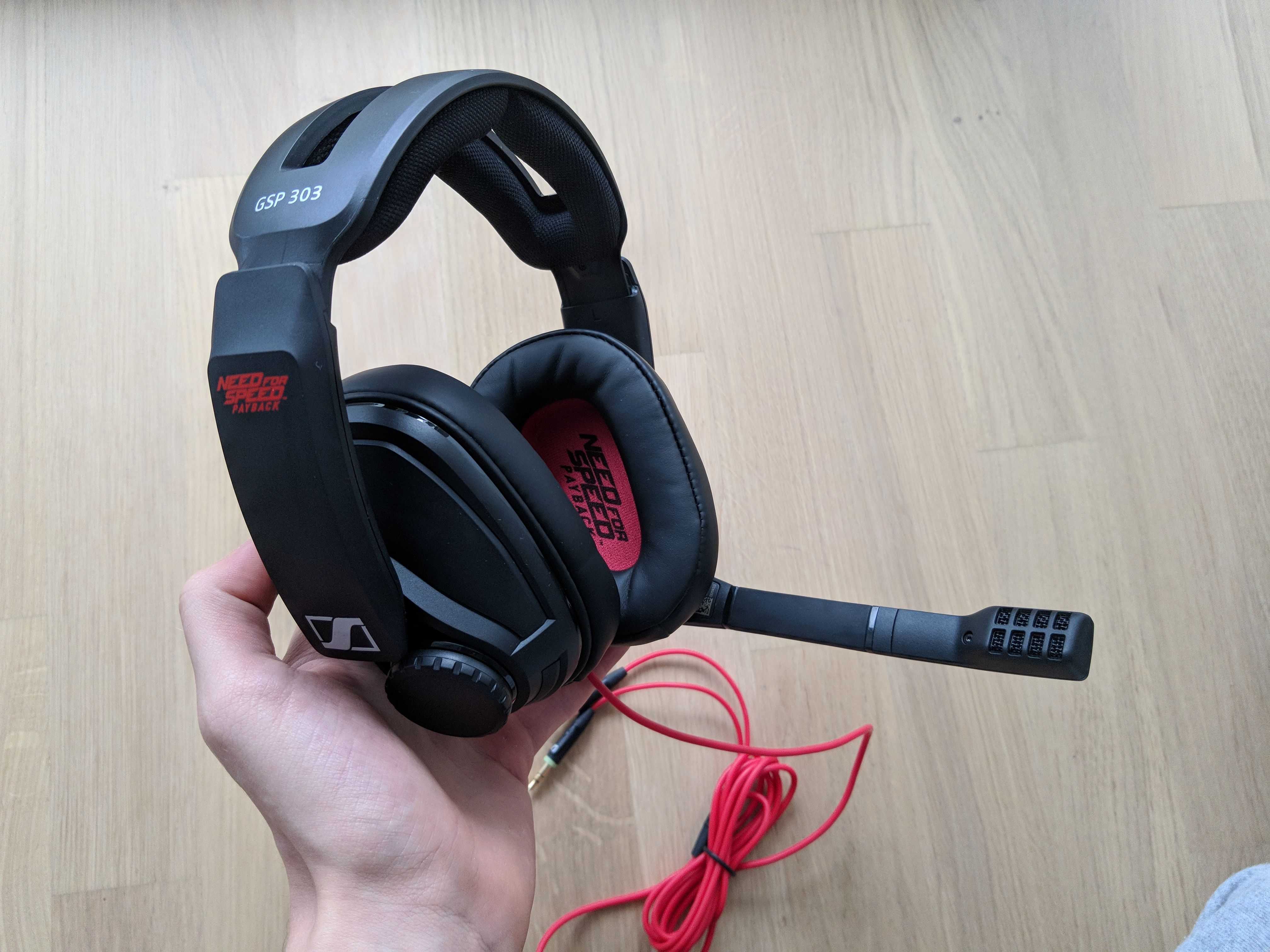 Das Headset besteht aus einem Hartplastikgestell, das insgesamt einen sehr robusten Eindruck macht. Neben dem Sennheiser-Logo und dem Modellnamen “GSP 303” wird das Headset vom Need For Speed Payback-Schriftzug geziert. Das Spiellogo ist auf beiden Seiten des Headsets sowie auf den beiden Ohrmuscheln aufgedruckt. Es ist nicht zu auffällig und sollte dementsprechend auch die nicht stören, die kein Fan des Rennspiels von EA sind. Die Farbkombination aus Rot und Schwarz resultiert in einer hübschen Optik. Auch das rote Kabel trägt dazu bei, dass das Gaming Headset ansprechend aussieht. Während es prinzipiell schick gestaltet ist, wirkt es etwas sperrig. Auf meinem Kopf sieht es erstaunlich groß aus und auch bei der Verstauung kann es stören, dass es so klobig ausfällt. Es kann nämlich nicht zusammengeklappt werden. Das ist aber nur ein kleines Manko und ändert nichts an der Tatsache, dass Sennheiser mit dem GSP 303 ein schickes Produkt entworfen hat.
