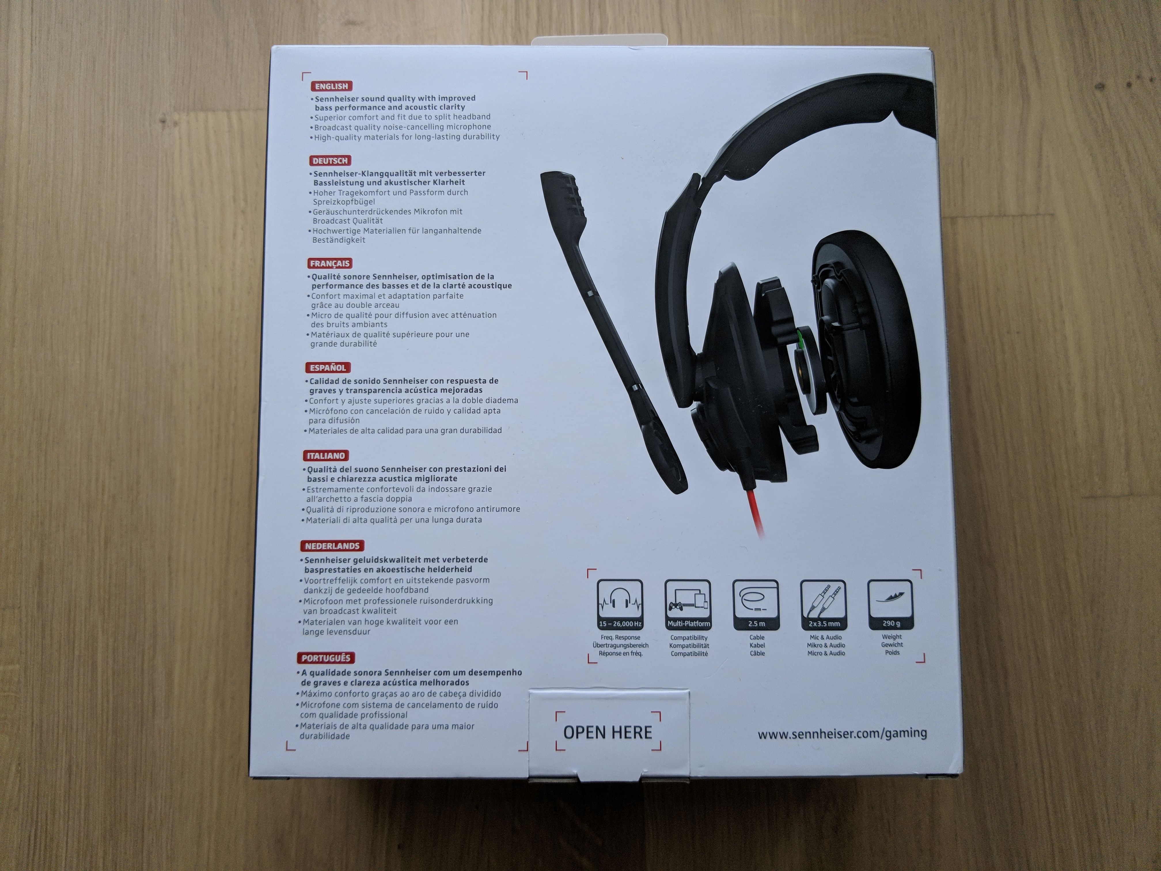 Der Packungsinhalt ist recht überschaubar. Der Fokus liegt natürlich auf dem gut verstauten GSP 303 Headset samt fest angebrachten Kabel mit zwei 3,5mm Steckern für Audio und Mikrofon. Weiterhin ist der “Sennheiser PCV 05 Combo Audio Adapter” beigelegt, durch den das Headset auch an eine einzige 3,5mm Eingangsbuchse angeschlossen werden kann. Dadurch kommt ein weites Spektrum an unterstützten Geräten zustande. Auf der Packung wird die Kompatibilität mit PC, Mac, PS4 und Smartphones sowie Tablets beworben. Aber auch die Xbox One (X), Nintendo Switch und MP3-Player aller Art können dank dem Adapter problemlos genutzt werden. Eine kleine Broschüre mit mehrsprachigen Sicherheitshinweisen rundet den Packungsinhalt ab.
